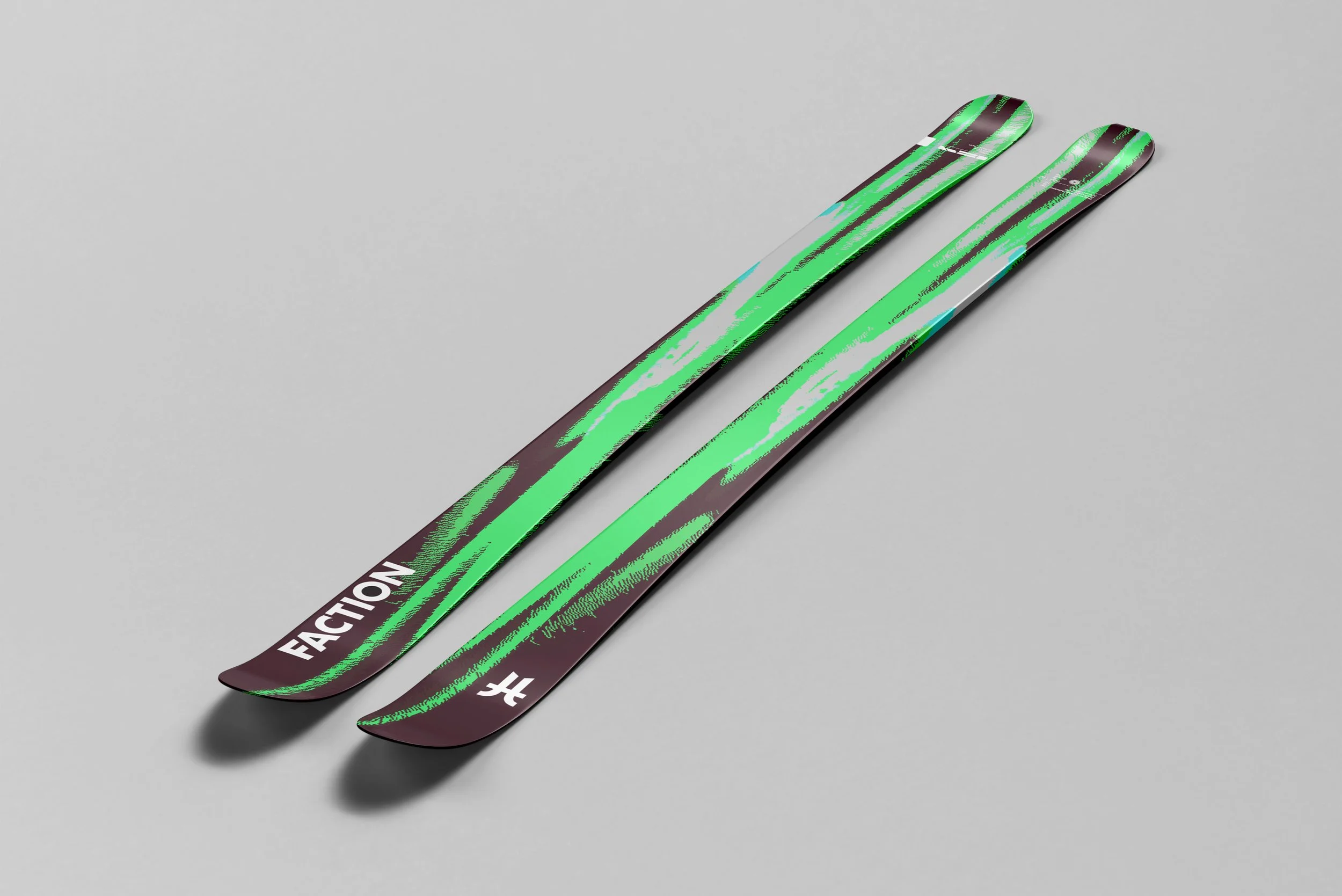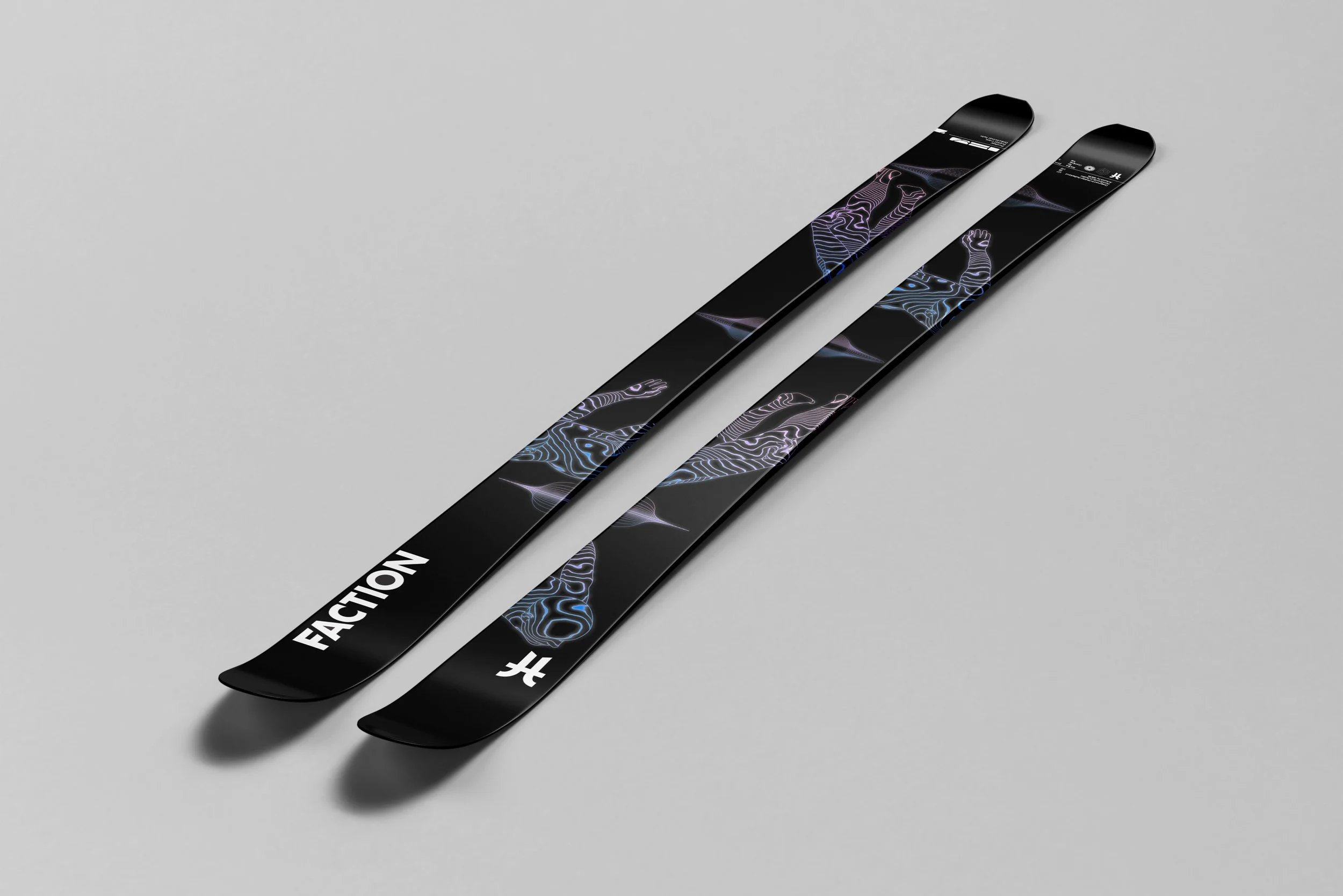 Design a line of skis featuring a minimalist but with a strong visual identity. Use a base of black, overlaid with glitch inspired graphics, fractured lines, pixelated patterns, and neon accents (example, electric blue or ghostly green). Use subtle metallic textures to evoke machinery, while organic, flowing shapes hint at the “ghostly” human element. The skis should feel cutting edge yet timeless.Physical Media: